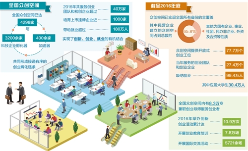 截至2016年底,众创空间已实现对全国所有省份的全覆盖,其中民营企业建立的众创空间占到总数的65.8%,其他为国有企业、事业、社团、民办非企业、外资及合资等性质。众创空间提供开放式创业工位77.7万个,当年服务的创业团队和创业企业27.4万个,吸纳就业99.4万人,其中应届大学生30.4万人。